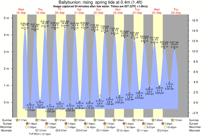 Image captured 54 minutes after low water (rising spring tide). Tide height was 0.4m (1.4 ft). Range 5.09m (16.7 ft). Toggle tide graph