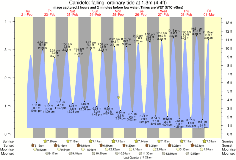 Image captured 2 hours and 2 minutes before low water (falling ordinary tide). Tide height was 1.3m (4.4 ft). Range 3.59m (11.8 ft). Toggle tide graph