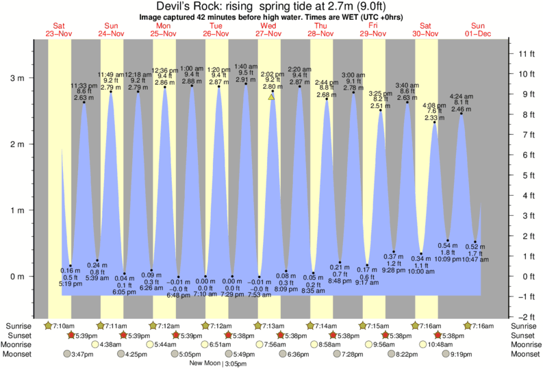 Image captured 42 minutes before high water (rising spring tide). Tide height was 2.7m (9.0 ft). Range 3.52m (11.5 ft). Toggle tide graph
