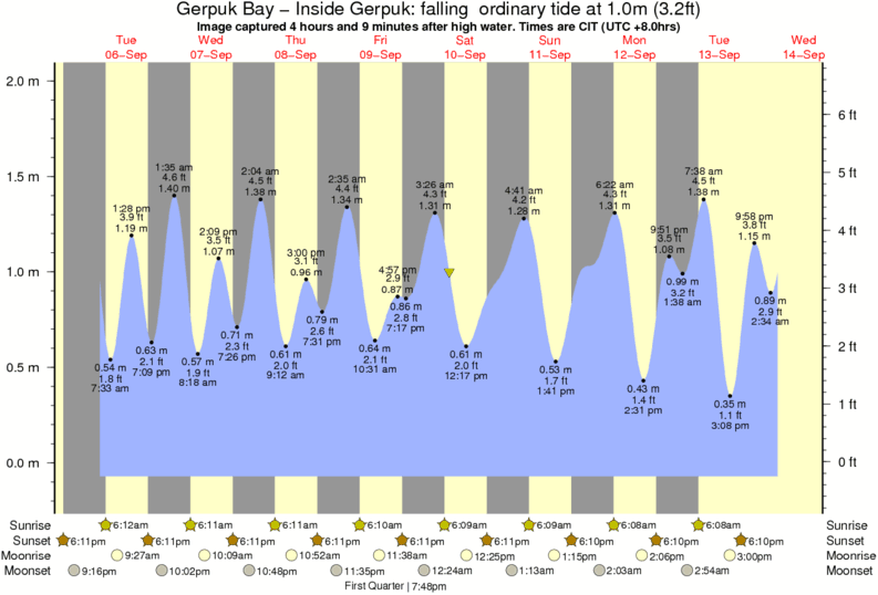Image captured 4 hours and 9 minutes after high water (falling ordinary tide). Tide height was 1.0m (3.2 ft). Range 1.97m (6.5 ft). Toggle tide graph