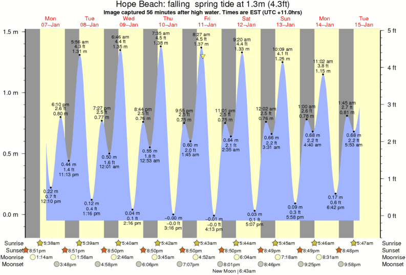 Image captured 56 minutes after high water (falling spring tide). Tide height was 1.3m (4.3 ft). Range 1.43m (4.7 ft). Toggle tide graph