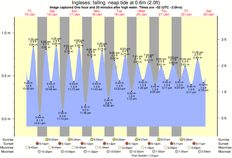 Image captured One hour and 30 minutes after high water (falling neap tide). Tide height was 0.6m (2.0 ft). Range 1.16m (3.8 ft). Toggle tide graph