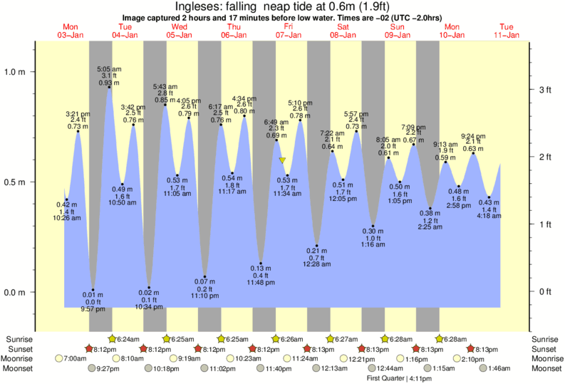 Image captured 2 hours and 17 minutes before low water (falling neap tide). Tide height was 0.6m (1.9 ft). Range 1.10m (3.6 ft). Toggle tide graph