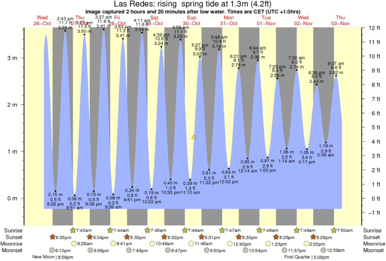 Image captured 2 hours and 20 minutes after low water (rising spring tide). Tide height was 1.3m (4.2 ft). Range 3.53m (11.6 ft). Toggle tide graph