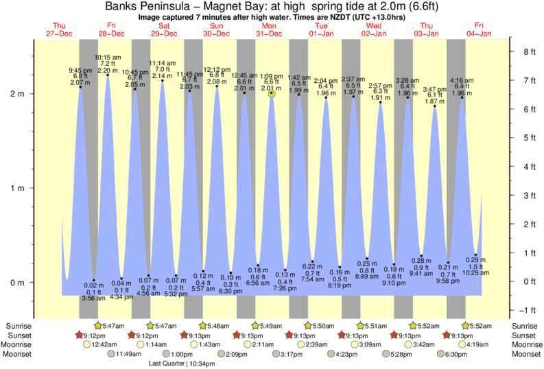 Image captured 7 minutes after high water (at high spring tide). Tide height was 2.0m (6.6 ft). Range 2.47m (8.1 ft). Toggle tide graph