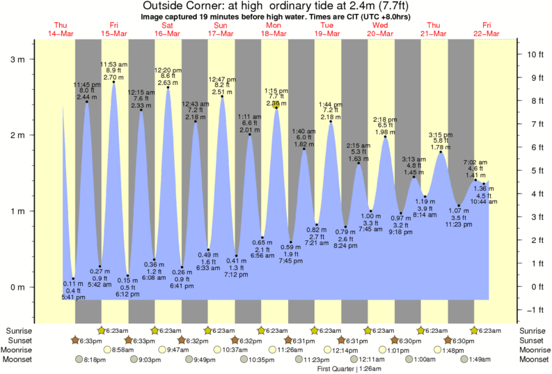 Image captured 19 minutes before high water (at high ordinary tide). Tide height was 2.4m (7.7 ft). Range 3.12m (10.2 ft). Toggle tide graph