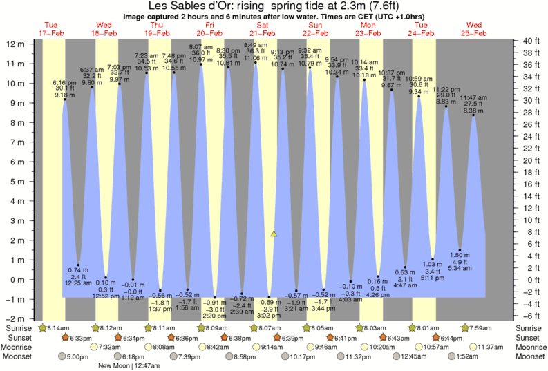 Image captured 2 hours and 6 minutes after low water (rising spring tide). Tide height was 2.3m (7.6 ft). Range 11.97m (39.3 ft). Toggle tide graph