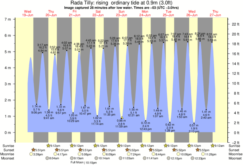 Image captured 28 minutes after low water (rising ordinary tide). Tide height was 0.9m (3.0 ft). Range 6.44m (21.1 ft). Toggle tide graph
