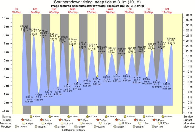 Image captured 32 minutes after low water (rising neap tide). Tide height was 3.2m (10.3 ft). Range 10.29m (33.8 ft). Toggle tide graph
