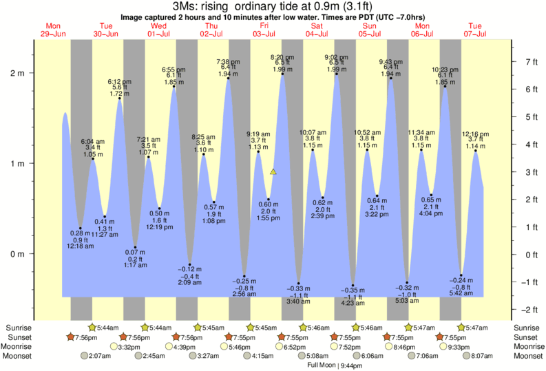 Image captured 2 hours and 10 minutes after low water (rising ordinary tide). Tide height was 0.9m (3.1 ft). Range 2.59m (8.5 ft). Toggle tide graph
