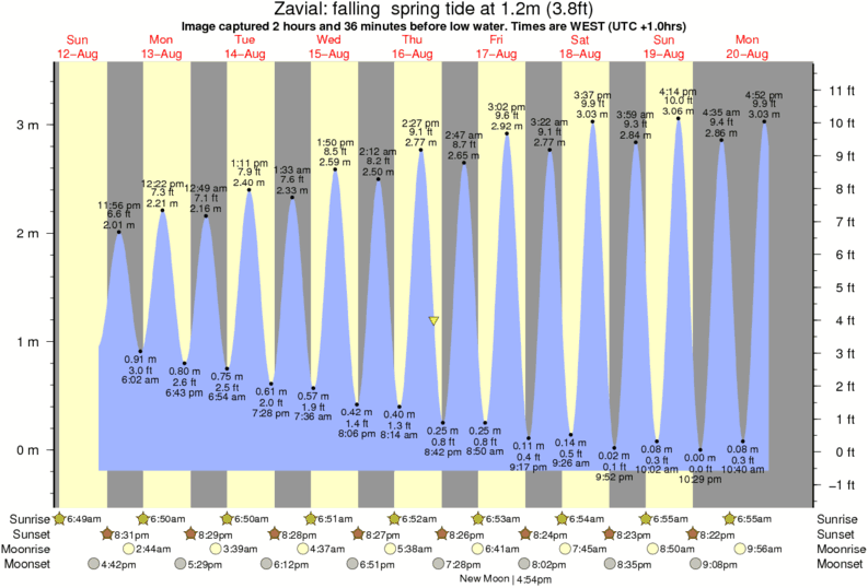 Image captured 2 hours and 36 minutes before low water (falling spring tide). Tide height was 1.2m (3.8 ft). Range 3.43m (11.3 ft). Toggle tide graph
